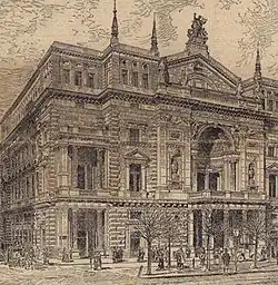 Given that the footprint of the theatre was small—and the theatre was intended to hold an audience of 1700—the architect was forced to build high, but with disastrous consequences. On December 8, 1881, a fire broke out due to a problem with the gas lighting system, shortly before a performance of Les contes d'Hoffmann,[1] and at least 384 people were killed.[2] The following year, a new law was passed, regarding the outfitting and safety provisions, including safety curtains, outward-opening doors, and fireproofing of the set.
