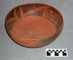 The use of red-and-black painted designs apparently began on vessels with yellow slips, but as time went on other slip colors were used. The probable first type in this tradition was Cieneguilla Glaze Polychrome, which differs from Cieneguilla Black-on-yellow by the addition of red (matte) paint elements outlined in black (glaze) paint. Cieneguilla Polychrome dates from AD 1325 to 1425. When B rims rather than A rims are present, this type becomes Largo Glaze Polychrome (AD 1400 to 1450).