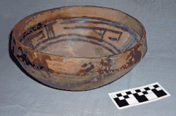 San Clemente Glaze Polychrome dates from AD 1315 (?—this is probably too early) to 1425. In this type, the interior and exterior of each bowl is slipped in a different color. (In jars, the uppermost and most easily reached part of the interior is slipped a different color.) The black glaze paint design applied over the slip often includes dots and serrated lines. San Clemente Polychrome occurs from Albuquerque south.