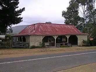The Rising Sun Inn is a simple vernacular cottage, constructed of vertical ironbark slab walls and doubled gabled roof. A verandah to front and sides on timber posts. A two room eastern addition has been extended to two rooms plus passage. The kitchen, with large brick double fireplace once a sperare building, is now joined to the main building.[4][1]
