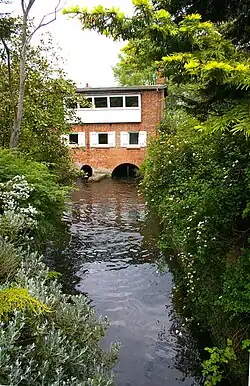 From here the river runs through a gentle sloped valley westwards and passes under the B1153 road and into Hillington Park. There is a tributary spring in a meadow on the Hillington side of Pond Farm, at Congham. This tributary of the river is called the River Cong, flowing through the woods and over an impressive waterfall, where in the past it powered all the machinery within the Congham Oil Mill. The Cong then flows on under the A148 and joins the Babingley close by the Gatton Waters caravan site. After Hillington Park the river flows into the lake that served another long-gone watermill that stood close to Hillington Hall The now increased force of water once powered the large waterwheel at what, years ago was known as West Newton Paper Mill.[3] It changed over from making paper to grinding corn which lasted up until a few years after the last war. From the lake the river runs through a wooded valley out of the Park and into the countryside south of the royal estate of Sandringham. The banks of the river along this stretch are very wooded. Just past Hillington, the river passes the northern edge of a lake that has been used as a camping and caravan site.