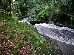 This river is perhaps unique in the British Isles in that there are in fact two separate rivers sharing the same name and occupying the same valley but which are not hydrologically connected. The upper Giedd rises on the southern slopes of the Old Red Sandstone mountain, Fan Brycheiniog in the Black Mountain (Y Mynydd Du) and heads south-southwest for about 3 km / 2 mi until, as it enters onto the Carboniferous Limestone outcrop it disappears into its bed. A dry valley continues in the same direction beyond the sinks and, as it crosses the Millstone Grit outcrop, gradually acquires a stream which is joined by others to become the lower Giedd. This separate river flows for about 6 km / 4 miles, passing the small village of Cwmgiedd, to its confluence with the River Tawe at Ystradgynlais in the Swansea Valley.[1][2]