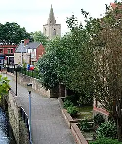 The next mill on the river was Town Mill, which had been built in 1744, and was used for grinding corn and malt. The miller, William Smith, negotiated with the Duke, and in 1785 he sold the corn milling equipment and refitted it for working with cotton. Having also refitted Field Mill in the autumn, he started a Sunday School in 1786, so that his young workers would be equipped with basic reading and mathematical skills, as well as moral instruction. The practice spread, and Mansfield became known for the good education of its young people.[19] Town Mill became Old Town Mill in 1870, when a steam-powered mill was built to the east of the river, which became known as New Town Mill.[21] Stantons Mill, the next downstream, was built in 1795.[2] By 1900, it had been taken over by Luke Weatherall, who made workmen's boots there.[22] The final textile mill on the river in Mansfield at the time was Bath Mill, on Bath Lane, which began operation in 1792 producing worsted cloth. Benjamin Bagshaw, John Radford and George Simes were the men behind the venture, but it was not a success, and the mill had become a cotton mill by 1800, when it also became one of the first locations in the vicinity to install a steam engine.[23] One effect of the conversion of mills for cotton, rather than grinding corn, was that a number of windmills were built, since corn still had to be milled into flour. The number of windmills in Mansfield rose from three to thirteen between 1774 and 1824.[21]
