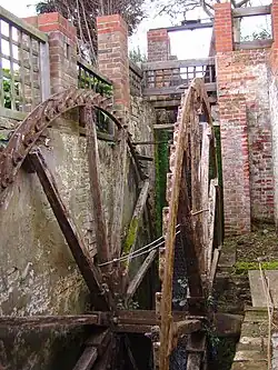 The river now fills another mill pond where once the second mill on the river worked. Mundesley watermill[3] was built c.1723 and consisted of two brick floors supporting a weather boarded upper floor and roof space under a Norfolk pantiled roof. Seen from the roadside, Mundesley Mill has five floors but if you took the public pathway round to the back, only two would have been visible. This is because the mill pool lying behind was level with the third floor. The builders set the mill deep into a high bank, over which the water would have fallen freely in the old days before findings its way to the beach, although it is quite possible the water was diverted to this point for the purpose of driving the mill. Unusually the mill had an overshot waterwheel. The only way to provide a sufficient head of water was to dam the river to form the mill pond we see today which is some considerable height above the road. When the mill was working, 8 million gallons of water flowed through per day. When the mill was worked by the Larter family in the 1920s, the deeds stated that anyone interfering with the river had to pay dues to the millers. The Larter family also used the mill to generate electricity, which also supplied power to some of the surrounding properties including a Bell's grocery shop, Larter & Rudran's bicycle garage and a property at The Dell. The mill burnt down in November 1956. Some of the cog wheels were still visible in their mountings within the shell of the building in 1959. The remains of the building were finally pulled down in the summer of 1965. The waterwheel was large with a diameter of 26 feet (7.9 m) and the owner of the Mill House decided to enclose the wheel behind a grill and to leave it as a showpiece. The wooden spokes and the rim can still be seen, and some of the metal scoops and some wooden cogs have been replaced. For many years it still turned whenever enough water was available. The river's water flowed over the wheel and then under the road and into the North sea through a pipe.