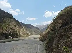 The Chenab River (Vedic name Askni), the largest river (in terms of volume of water) is formed after the meeting of two streams namely, Chandra and Bhaga at Tandi, in Lahaul. It flows 122 kilometres (76 mi) and covers an area of 7,500 square kilometres (2,900 sq mi) in Himachal Pradesh, before entering Jammu and Kashmir. The Chandra passes through the barren tribal land.