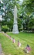 A monument designed by George F. Meacham to commemorate the soldiers and sailors from Fairhaven who had died in the Civil War was erected in the cemetery in 1868. Twenty members of the Delano family, including Warren Delano I and Warren Delano II, are buried in the Delano family tomb. The tomb was erected in 1859 and designed by Richard Morris Hunt.[2] Henry Huttleston Rogers, his wife Abbie G. Rogers, and three of their children are interred in a mausoleum erected in 1893 which was designed by Charles Brigham after an ancient temple to Minerva. Other notable burials include: