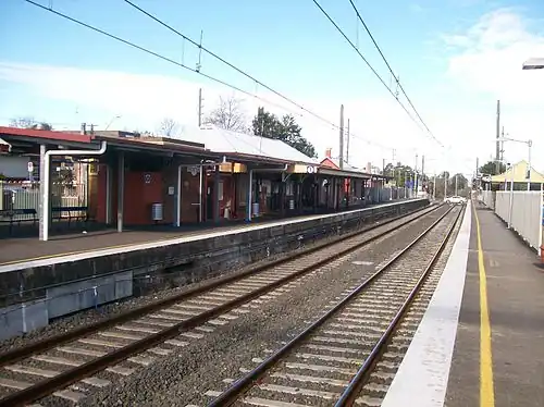 The station building on Platform 1 is composed of a number of buildings. The first is a single storey, c. 1880s face brick symmetrical building with two flanking, parapeted wings, which includes a central waiting room with office on one side and the former ladies waiting room on the other, connecting to toilets in the eastern wing. The western wing is the former lamp room. The wings are linked to the main building by small, flat roofed rooms. The roadside elevation is fronted by an ogee profile timber and iron framed verandah between two projecting wings, while on the rail side there is a cast iron fluted column and metal framed awning with decorative brackets. The roadside faces the motor traffic forecourt which swings around the war memorial. Connected to the eastern end of the main building is a brick building under the same flat roof as the more modern shops that face the road behind it. This is linked to the previously free standing, original ticket office.[3]