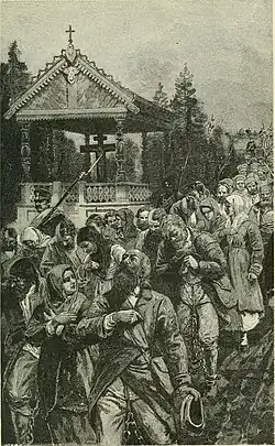 In one incident, a Russian soldier requested to see his wife, and the Russian government responded by arresting her, binding her in chains, and forcing her to walk thousands of kilometres as part of a Siberian prisoner contingent, living among the étapes, "maimed, insulted, violated". The prisoners' temporary allotment is "a dog-kennel, a stable, a black hole – anything but a place to live in".[3]
