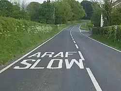 Bilingual signs in Wales were permitted by special authorisation after 1965. In 1972 the Bowen Committee recommended that they should be provided systematically throughout Wales. Throughout Wales, instructions for drivers appear on the road itself. One of the most common painted instructions is araf – slow.