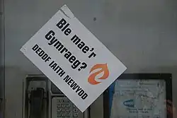 The Welsh Language (Wales) Measure 2011 set out regulations that came into force on 31 March 2016 that now mandates that all signs be in Welsh first, with the existing "English-priority" signage (in those areas where the local authority previously had such a policy) being replaced whenever they otherwise would (life expiry or altered road conditions).[2] The Welsh Government states in its Welsh Language Standards, Article 119, page 17, that; 'Where a sign contains the Welsh language as well as the English language, the Welsh language text must be positioned so as to be read first.' and; 'Replacement signage on Welsh Government trunk roads will be taken forward as part of general rolling programme of renewals with priority given to main routes.'[3] The previous Welsh Language Scheme stated that English-only signs would be made bilingual when they were replaced, and that the order in which the languages appear would follow the practice adopted by the local authority where the sign is located.[4]