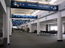 Landside facilities, or the facilities outside the TSA security checkpoint, include check-in, car rental, baggage claim and a taxi hire. The upper level has a small cafe and newsstand. The upper-level Airside, or the facilities located inside the TSA security checkpoint, has seven gates (Gates 1–6 and 5A) and a small cafe area.[33] The entire terminal has been a free Wi-Fi hotspot since April 2, 2003.[34]