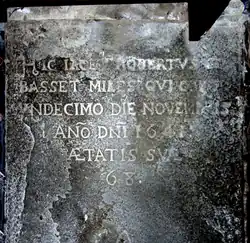 Hic jacet Robertus Basset, Miles, qui (obiit) undecimo die Novembris An(n)o D(omi)ni 1641 aetatis suae 68 ("Here lies Robert Basset, Knight, who died on the 11th day of November in the year of Our Lord the 1641st, of his age the 68th")