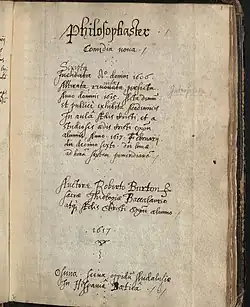 Though Burton's legacy lies almost exclusively in his authorship of the Anatomy, his Philosophaster has increasingly been examined alongside it. As Murphy observed, Philosophaster "has received more attention than most of the other surviving examples of university drama."[1] Since its first, mid-19th-century publication in Latin, it has been published three more times, twice with original translations into English.[q] In 1930, it was even performed at the University of California.[150] The play has received a mixed reception from modern scholars. Literary critic Martin Spevack dismissed it as "an obvious and elementary string of transparent sketches".[151] O'Connell has, however, described it as "perhaps the most appealing of Burton's Latin works", he notes that the "liveliness in its representation of university life" redeems the "weak plotting and flat characterization."[152] The 19th-century critic of Elizabethan drama Arthur Henry Bullen wrote of it that the philosophasters "are portrayed with considerable humour and skill, and the lyrical portions of the play are written with a light hand".[101] Bamborough summed it up as "not without genuine merit, particularly in the satirical portraits of pretenders to learning."[3]