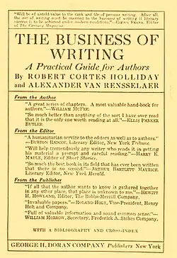 He then sold books, worked as a librarian, and became a literary editor at the New York Tribune, Doubleday, Page & Co., and George H. Doran & Co. before taking an editorial position with The Bookman, serving as its chief editor from 1919 to 1920. After he left The Bookman in 1923, Holliday continued his criticism, worked for brief stints in advertising, and in 1926 became an instructor on writing for publication. Holliday also published fifteen books, including The Walking-Stick Papers (1918), Men and Books and Cities (1920), Literary Lanes and Other Byways (1925), as well as volumes on Booth Tarkington and poet Joyce Kilmer (for whom he served as literary executor).