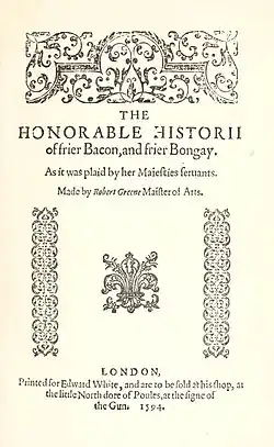 Title page of Greene's Friar Bacon and Friar Bungay (1594 edition)