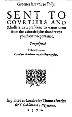 Robert Greene (1558–1592) was an English author popular in his day, and now best known for a posthumous pamphlet attributed to him, Greene's Groats-Worth of Witte, bought with a million of Repentance, widely believed to contain an attack on William Shakespeare. Greene was a popular Elizabethan dramatist and pamphleteer known for his negative critiques of his colleagues. He is said to have been born in Norwich.[1] He attended Cambridge where he received a BA in 1580, and an M.A. in 1583 before moving to London, where he arguably became the first professional author in England. He was prolific and published in many genres including romances, plays and autobiography.