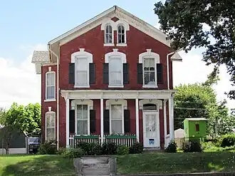 The Robert Henne House is a historic building located in the West End of Davenport, Iowa, United States. This Greek Revival style residence was built for Robert and Henrietta Henne in 1874. He operated the cigar stand in the post office. She continued the business after his death in 1885. The house followed a popular 19th-century style in Davenport that has some unique features.[2] The gable-end oculus is located on the side of the house as opposed to the front. On the front are a pair of round-arch windows. The windows that face the front of the house feature keystone window heads that drop to small molded corner blocks and are flush to the brick. Molded panels are found on the porch frieze and on the soffits and reveals on the main entrance. The house has been listed on the National Register of Historic Places since 1983.[1]