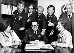 Realizing that much of the art of military medicine was understanding the military as much, or more, than understanding medicine, Joy used his connections on the Joint Staff and in the Offices of the Secretary of Defense and elsewhere in the greater DC area to bring in guest speakers to lecture the students on military topics. Joy would hold these lectures at 1400-1600 on Fridays, but would notoriously run long in those early days and would often end up moving to the Officers Club afterwards, where the students could further interact with the guest speakers. Although a bit rough at first, with the inaugural class nicknaming themselves the "Charter Martyrs," by the time Joy stepped down as chair of the department of military medicine and history in 1981, the training was well synchronized and coordinated.[46]