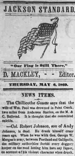 - ^ Mackey, D., ed. (May 6, 1869). "Col. Robert Johnson, son of Andy Johnson, is dead". The Jackson Standard. Jackson, Ohio – via NewspaperArchive.com.