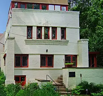 The simple, boxy shape of the Lamp House was quite modern for its time and stands as a precursor of Wright's breakthrough to abstraction by 1905. Together with the contemporaneous Dana–Thomas and William E. Martin Houses, it marks a transition between the styles of the Chicago School and the Prairie School. Contemporaries dubbed it "New American" in design,[5] while the casement windows were "Old English" in inspiration. Some elements, including the fussy, diamond-shaped ornamentation in the brickwork and the truncated corner piers rising to the height of the second-story window sills, have been attributed to Wright's draftsman Walter Burley Griffin.[5] Massive corner piers are a hallmark of Wright's nearly contemporaneous Larkin Building (1904) in Buffalo, New York. The exterior walls are constructed not of house brick but of cream-colored commercial brick, which Wright also used for his own home (1895) and studio (1898) in Oak Park, Illinois. The Lamp House's diamond-paned windows with frames painted a dark brownish red also echo those of Wright's Oak Park home and studio, which Lamp visited many times. At some time after Lamp's death, the building was painted white.