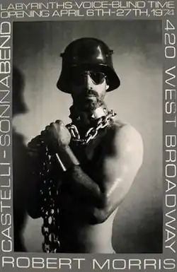 In 1974, Robert Morris advertised his display at the Castelli Gallery with a poster showing him bare-chested in sadomasochistic garb. Critic Amelia Jones argued that the body poster was a statement about hyper-masculinity and the stereotypical idea that masculinity equated to homophobia.[16] Through the poster, Morris equated the power of art with that of a physical force, specifically violence.[17]