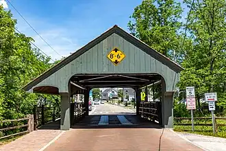 Sixteen days later, the driver of a box truck struck the top of the bridge cover and damaged two posts and its lateral bracing, forcing it to close due to stability concerns.[14] The cover was removed and replaced with a temporary overhead barrier, which allowed it to reopen to traffic in September 2018.[15] Between March and June 2020, the entire bridge was moved offsite as crews replaced the abutments and repainted the bridge. A new cover—clad in wood and reinforced by steel—was added during the summer,[11] and the $1 million renovation project concluded with a reopening ceremony on August 14.[4] The next day, it was hit again, this time by a school bus; according to the county sheriff's office, since the reopening, there have been at least 53 bridge strikes as of June 2024.[9] This high volume has caused the town to consider additional measures to prevent collisions: electronic height sensors, clearance bars further away from the bridge, more visible warning signage, and working with online mapping services to discourage the route when providing directions.[7]