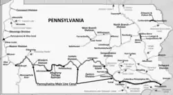 | Historic canals of Pennsylvania in the 19th Century, with the Pennsylvania Main Line Canal highlighted. Not all canals existed simultaneously. |