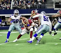 In week 4 against the New Orleans Saints, Quinn sacked Teddy Bridgewater twice in the 12–10 loss.[55] In week 6 against the New York Jets, Quinn sacked Sam Darnold twice in the 24–22 loss.[56] In week 7 against the Philadelphia Eagles, Quinn recorded a sack on Carson Wentz before leaving the game with a rib injury. Without Quinn, the Cowboys won 37–10.[57] He finished the season with 25 tackles, 11.5 sacks (led the team), 37 quarterback pressures, three passes defensed and two forced fumbles.[58][59]