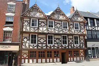 Robert Raikes' House was built for use as a merchant's house in 1560. In the early 18th century the rear of the house was extended and internal alterations were carried out. Robert Raikes the Elder started publishing the Gloucester Journal from the building on 9 April 1722. Robert Raikes, the Younger moved his printing business into the house in 1758 where he continued to publish the Gloucester Journal. In 1772, he moved into the house to live with his family.[5] Robert Raikes was a promoter of the Sunday school movement, he held Sunday school sessions in the house's garden and Robert's wife used to serve plum cake to the children.[6][7] After his death, it was again used as a merchant's house and shop. There were minor alterations made to the building throughout the 19th and 20th centuries. In 1952, the building was grade II* listed.[8] In 1973, the Dirty Duck restaurant opened on the site later becoming the Golden Cross public house in 1975. In 2006, Samuel Smiths bought the building and spent £4.5 million on its restoration.[9] As part of this restoration, the shop front was replaced by more traditional wood-framed walls, also the Malt and Hops pub in the rear courtyard was demolished. It reopened in November 2008 as a public house.[10][11][8][12][13]