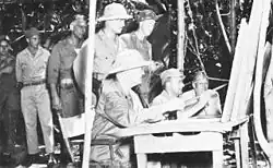 On September 5, 1945, Beightler accepted articles of surrender from Major General Iguchi, commanding general, 80th Brigade, Imperial Japanese Army, in Luzon, Philippines.[20]