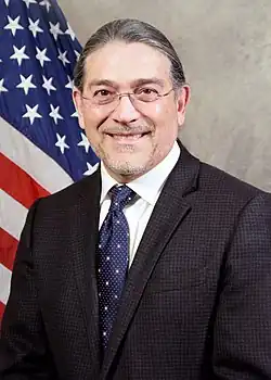 Santos was confirmed as United States Census Bureau Director by the U.S. Senate on November 4, 2021,[7] and was sworn in on January 5, 2022.[8] Santos is of Mexican American heritage. He is the first Latino person to serve as permanent, Senate-approved director of the Census Bureau (James F. Holmes, a Black man, was acting director of the Census Bureau in January-October 1998).[9]