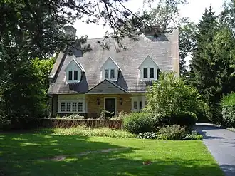 Robinwood was built in 1908 by Joy Wheeler Dow, an architect who wanted to contrast the styles of Frank Lloyd Wright and Walter Burley Griffin while still maintaining appeal to the growing middle class. He had no formal training, and primarily built single-family homes in New Jersey. Robinwood was particularly heavily influenced by one of Dow's buildings, Princessgate, in Wyoming, New Jersey. English-based designs were popular in the northwestern suburbs of Chicago—Tudor Revival style residences were particularly popular in Elmhurst. It is thought that Robinwood was somewhat influenced by the style, but more-so by the Arts and Crafts Movement burgeoning in England. Bernice Miller lived in the house until her death in 1936, when it was passed on to her sister, Jessie Porter.[1] Mr. and Mrs. Almerico purchased the home in 1968. Robinwood was sold to Dr. And Mrs. Miller in September 2013.