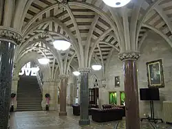 The stone Grand Staircase, which leads from the vestibule to the Great Hall, is decorated with stained glass; such glass windows decorate most of the Town Hall and are considered to be the finest example of the work of Heaton, Butler and Bayne.[33][34] The medieval style Great Hall, described by Pevsner as a room of "great splendour and simplicity",[34] has a hammerbeam roof flanked by statues of angels, in a design that resembles Westminster Hall.[4]