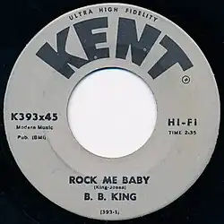 There is some confusion as to when B.B. King recorded "Rock Me Baby". Although King had signed to ABC-Paramount Records on January 14, 1962, his former label, Kent Records, continued to release singles (and albums) well into the 1970s.[8] Recording dates have been estimated as "about 1958"[8] to before 1962.[1] The song was released shortly after King's Paramount release "How Blue Can You Get" in 1964 and reached number 34 in the Billboard Hot 100.[9][a] "Rock Me Baby" was the first of six B.B. King records to reach the Top 40.[9] In 1997, King re-recorded the song with Eric Clapton for the album Deuces Wild.