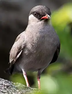 The rock pratincole (Glareola nuchalis) is a native African wading bird. Mature adults have dark gray or brown plumage with a white line beginning beneath the eye extending to the back of the neck like a collar. Their wings are long and dark with a distinct white patch on the underwing. Their tail is forked and they usually have a white belly. The bill is black with a red base and the legs and eyes are coral red. Both sexes emit a faint whistling contact call and musical purring but can become very noisy when aggressive.[5] Glareola nuchalis measurements: length: 16.5–19.5 cm; wing: 14.3–16.0 cm; bill: 10-12 mm; tail: 5–6 cm; mass: 43–52 grams.[6]