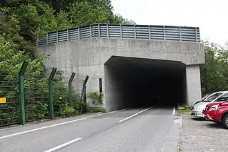 A rock shed is a civil engineering structure used in mountainous areas where rock slides and land slides create highway closure problems. A rock shed is built over a roadway that is in the path of the slide. They are equally used to protect railroads.[1] They are usually designed as a heavy reinforced concrete covering over the road, protecting the surface and vehicles from damage due to the falling rocks with a sloping surface to deflect slip material beyond the road,[2] however an alternative is to include an impact-absorbing layer above the ceiling.[3] A further use of this type of structure may be seen protecting the A4 road; although constructed primarily to alleviate risk from falling rocks from a limestone seam[4] it also serves to protect against objects or persons falling from the Clifton Suspension Bridge[5] where the height differential of approximately 70 metres from the bridge to the bottom of the Avon Gorge would give sufficient kinetic energy to even a relatively small item to cause injury on impact.