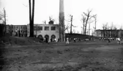 Baseball game or practice at Rockwell in the 1930s. Merrill Hall, the original heating plant, and Lowry Hall can be seen in the background