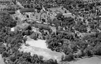 Aerial of Kent State University in the early 1930s with Rockwell Field visible at bottom center
