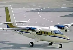 Vail Airways began operations with Cessna 310 piston twin aircraft,[4] followed by the Rockwell Aero Commander piston twin.[5] In 1969, Rocky Mountain Airways expanded with the 19 passenger de Havilland Canada DHC-6 Twin Otter twin engine turboprop.[6] On February 3, 1978, Rocky Mountain Airways took delivery as the worldwide launch customer of the larger, 50 passenger de Havilland Canada Dash 7-102 four engine turboprop. In 1983, Rocky Mountain had placed an order for six 37-passenger de Havilland Canada DHC-8 Dash 8 twin turboprops,[7] coincident with the type's service introduction; however, no Dash 8 aircraft were subsequently delivered to Rocky Mountain.
