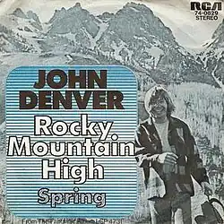 "Rocky Mountain High" is a song written by John Denver and Mike Taylor and is one of the two official state songs of Colorado.[1][2] Recorded by Denver in 1972, it is the title track of the 1972 album Rocky Mountain High, and rose to No. 9 on the US Hot 100 in 1973. Denver told concert audiences in the mid-1970s that the song took him an unusually long nine months to write. On April 10, 2017, the record was certified Gold by the Recording Industry Association of America for sales exceeding 500,000 digital downloads.