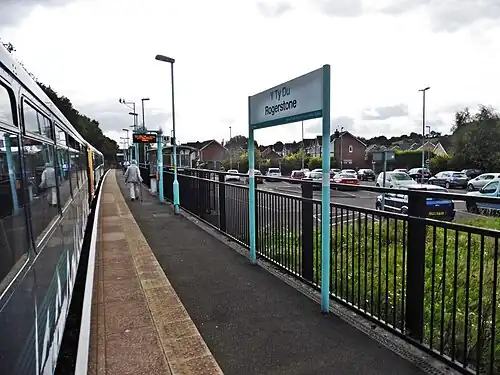 Rogerstone railway station (Welsh: Tŷ-du) is a station on the Ebbw Valley Railway in the community of Rogerstone in Newport, south Wales. The station is situated ½ mile north of the original station on the site of former rail sidings. The station is within the Afon Village housing development. Access to the single-platform station and associated car park is off Lily Way.