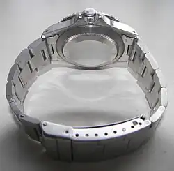 The Rolex Submariner is a line of sports watches designed for diving and manufactured by Rolex, resistant to water and corrosion.[1] The first Submariner was introduced to the public in 1954 at the Basel Watch Fair.[2] It was the first watch to be waterproof up to 100 metres (330 ft), although Blancpain's Fifty Fathoms watch, which was introduced in 1953, was certified to 94.5m (being fifty Fathoms).[3] The Rolex Submariner is considered "a classic among wristwatches",[1] manufactured by one of the world's most widely recognized luxury brands.[4][5][6][7] Due to its huge popularity, there are many homage watches by well-established watchmakers, as well as illegal counterfeits. The Rolex Submariner is part of Rolex's Professional line.[8]