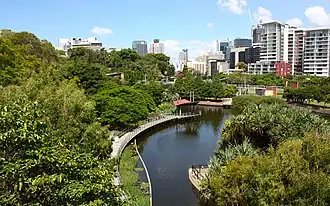 Roma Street Parkland covers 11 hectares in the centre of the City of Brisbane, Queensland, Australia. The Roma Street Parkland is adjacent to the former Brisbane Transit Centre and the Roma Street railway station from which it takes its name (the park does not directly face onto Roma Street). There is pedestrian access to the Roma Street Parkland from the Roma Street railway station, as well as from Albert Street, and from the section of the Parkland which was formerly called Albert Park on Wickham Terrace.[2][3] Roma Street Parkland is open to visitors 24 hours a day, except for the Spectacle Garden and Rainforest Walk, which are open daily from dawn until dusk.