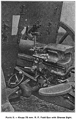 The first artillery panoramic field lenses, later adopted by all the armies of the world, were invented by the Romanian General Toma Ghenea.[10] Ghenea patented his "sighting attachment for ordnance" on 13 December 1902.[11] Beginning with 1902, the panoramic sight began to gain ground very rapidly. But by 1907, Ghenea's was still "one of the most perfect yet devised". It had compensating gear for drift-caused lateral deviations and level of wheels.[12] Ghenea's gun sight enabled sighting adjustments to be made rapidly, even for extreme alterations.[13] The vertical angle which the sight made with the axis of the gun could be read on a quadrant scale.[14] The Ghenea sight was peculiar because the pedestal itself was mounted on a transverse horizontal pivot to which the drum on which the elevation was set was attached. The pedestal itself was always perpendicular with the line of sight. The longitudinal level was just over the eyepiece of the panorama sight. In the Romanian Army, Ghenea's sight was fitted to the 75 mm Krupp L/30 field gun, being used for both direct and indirect laying.[15] The Ghenea sight allowed the gun layer to adjust the range during the return of the piece in battery, by lightly turning the elevation screw which was just in front of him, without having to take his eye off the level. The bubble of the level was brought to its central position as soon as the forward movement of the gun was finished. With an ordinary sight, changing the range elevation while the gun was in motion was impossible.[16]