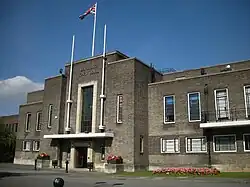 The Local Government Act 1894 reformed local government and created the Romford Urban District and Romford Rural District to replace the local board and sanitary district; following which the Romford parish was split into Romford Urban and Romford Rural along the lines of the urban district.[11] In 1900 the parish was recombined and the urban district expanded to cover all of the former area of the historic chapelry, except for Noak Hill which remained in the rural district and had become a parish in its own right in 1895.[11] The enlarged urban district formed part of the London Traffic Area from 1924 and the London Passenger Transport Area from 1933.[14] The suburban expansion of London caused an increase in population during the 1930s[1] and the urban district was expanded further in 1934, taking in the parishes of Havering-atte-Bower and Noak Hill.[10] It was incorporated as the Municipal Borough of Romford in 1937.[10] In 1965 the municipal borough was abolished and its former area was combined with that of Hornchurch Urban District; it was again removed from Essex and since then has formed the northern part of the London Borough of Havering in Greater London.[15][16] For elections to the Greater London Council, Romford was part of the Havering electoral division until 1973 and then the Romford electoral division until 1986.[17]