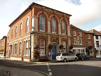 The first municipal building in the town was a medieval structure in the Market Place which was described latterly as "a small old house in bad repair".[1] In the 17th century civic leaders decided to buy a house at The Hundred and to convert it for use as a town hall and as a lock-up for petty criminals.[2] In 1736, the 1st Viscount Palmerston acquired Broadlands and thereby became lord of the manor:[2] it was in this building that he preferred to conduct his court business.[2][a] The building was used for cultural events: an audience of nearly 100 people attended a concert there in 1772[3] and, during the Swing Riots, the mayor permitted several hundred labourers, as well as the farmers, to attend a meeting at the town hall in 1830.[4]