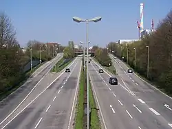 Rosa-Luxemburg-Straße (L3004) is a major grade-separated highway in Frankfurt am Main, Germany. At the southern end it connects to Miquelallee (deutscher Wikipedia-Link) and the Bundesautobahn 66 motorway close to the Europaturm and the Deutsche Bundesbank. The route runs as an elevated highway northwards through Ginnheim, where U-Bahn Line D joins to run in the central reservation through Niddapark and Römerstadt before passing immediately to the east of Nordwestzentrum.