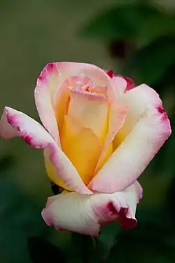 The high-centered, double-shaped flowers have 25–28 petals and a creamy-white colour with more or less pink-edged outer petals. The Ultimate Rose Book says that 'Garden Party' has "the 'Peace' colors but more delicate". The flowers develop from urn-shaped buds, reach an average diameter of 11 cm (4.5") and have a light lemony fragrance.[1] 'Garden Party' blooms repeatedly throughout the season.[2] Thanks to its large well-shaped flowers, it is a popular exhibition variety.[1]