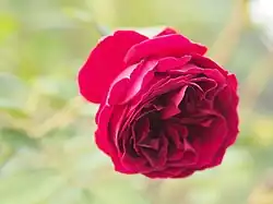 'The Squire' is an upright, open shrub rose, 3.5 to 5 ft (1.1–1.5 m) in height, with a 3 to 4 ft (0.91–1.22 m) spread. Medium-sized, double (120) petals are mildly cupped and rosette-shaped. The flowers are borne singly or in clusters of 1–5. Short, fat buds open to flowers that are bright crimson with darker red-black hues. The flowers fade to a dark pink colour and very quickly in very hot weather. 'The Squire' has a strong, old rose fragrance.[1] It also has dull, dark green foliage and many prickles. This rose is a better repeat bloomer than Austin's other early roses and is prone to mildew.[2][3]