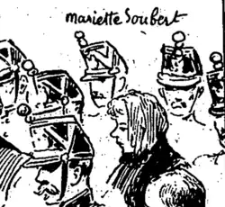 She appeared at her second trial wearing a black straw hat on her head and answered the interrogation with a smile.[30][31] Her lawyer was once again Eugène Crémieux for this second trial.[32] When the judge told her that the reports about her were not unfavorable, she misunderstood the remark and said she was surprised, which made part of the audience laugh.[31] She responded to her interrogatory with brief remarks, accused Chaumentin—who had denounced them—of lying, and then fell silent.[31] Later, Soubère was indignant and forcefully confronted Chaumentin when the latter publicly accused her during the trial of having sheltered Ravachol at her home while he was on the run.[33] She called him a liar, a wretch, and a scoundrel, and insisted she had only met Chaumentin in Paris and had not known him before.[33]